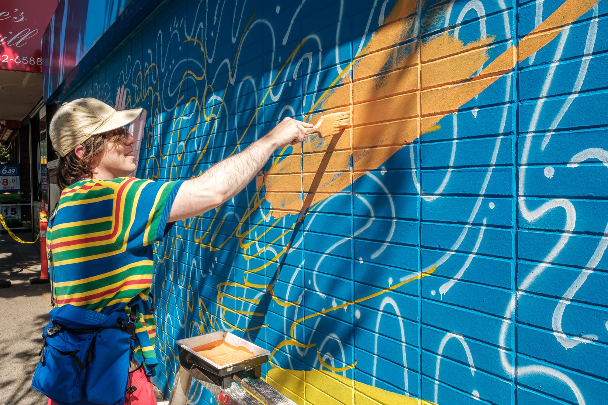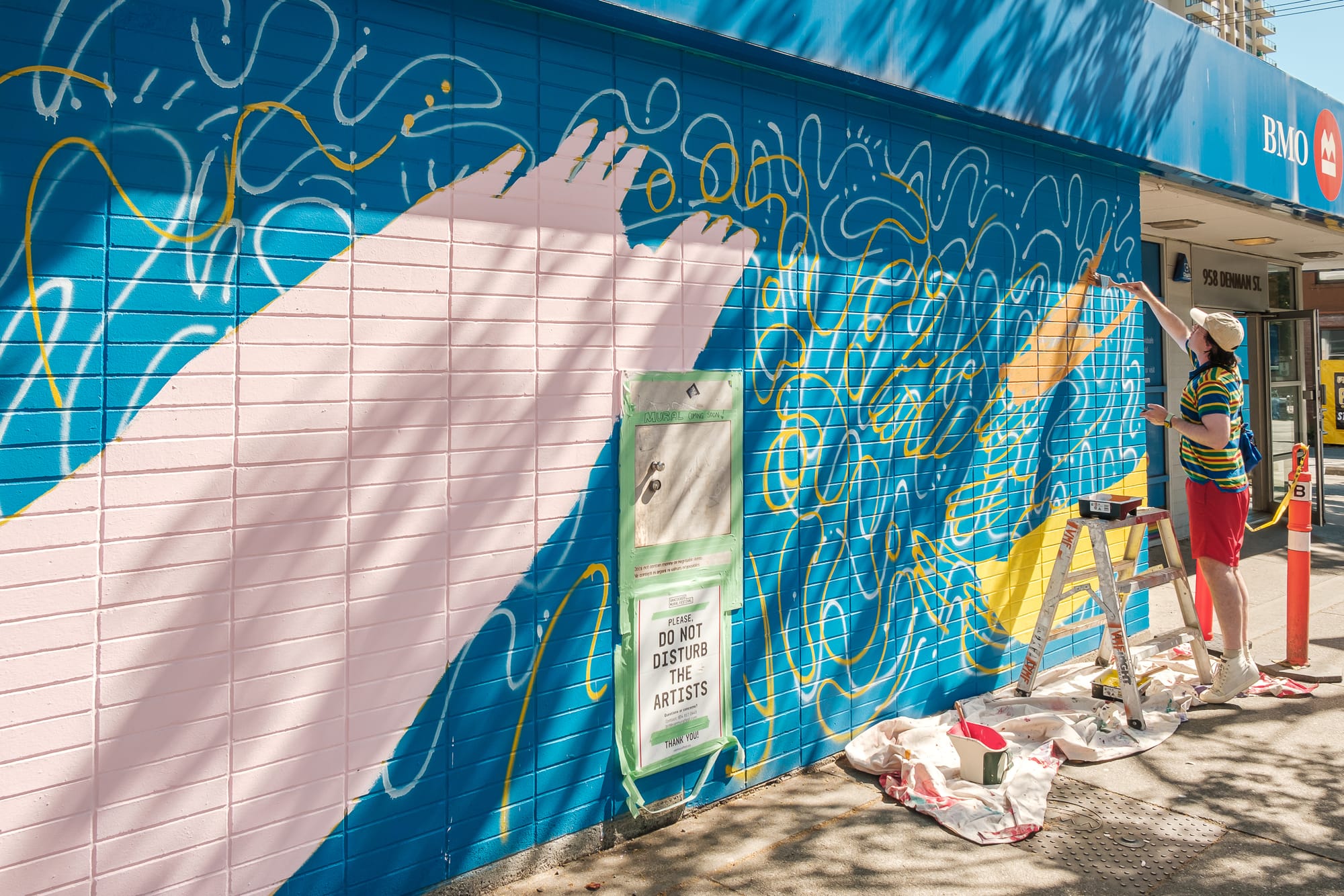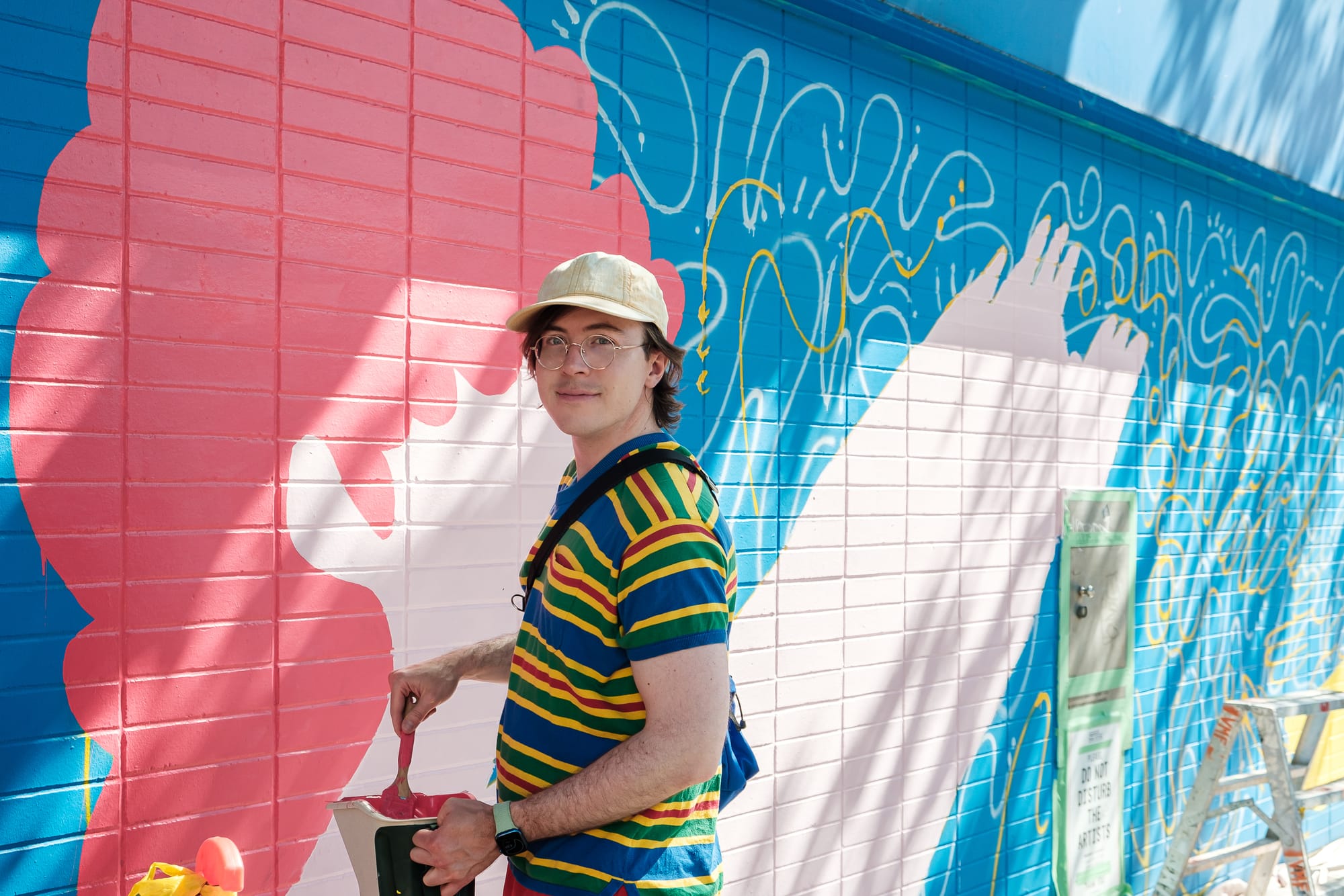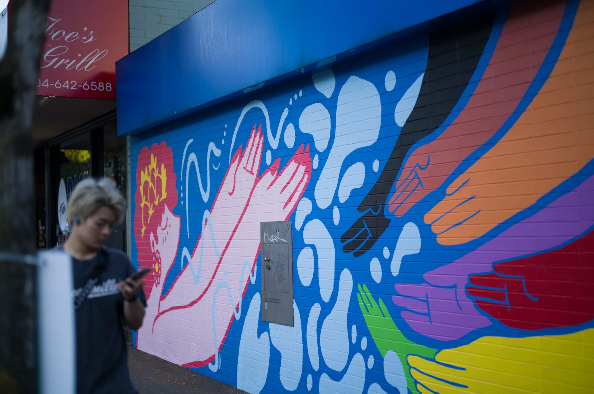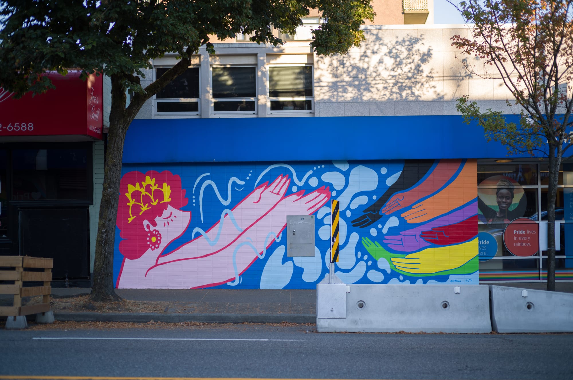 This mural depicts ted northe, an influential gay-rights activist and drag queen, extending his arms out to a community of hands matching colours representing bands of the Progress Pride flag. He helped organize protests and fostered community building since the 1950s, contributing to the structure of LGBTQS2+ policy and rights in Canada, including the decriminalization of homosexuality on June 27, 1969. With this mural, Matt wanted to show ted northe's personality and energy passing through to the community. His hands form a cloud of unique shapes—forms Matt uses often uses in his work to communicate our unique identities. He hopes that by seeing this mural, people can remember ted northe, and get inspired to learn more about ongoing LGBTQS2+ activism in Canada.